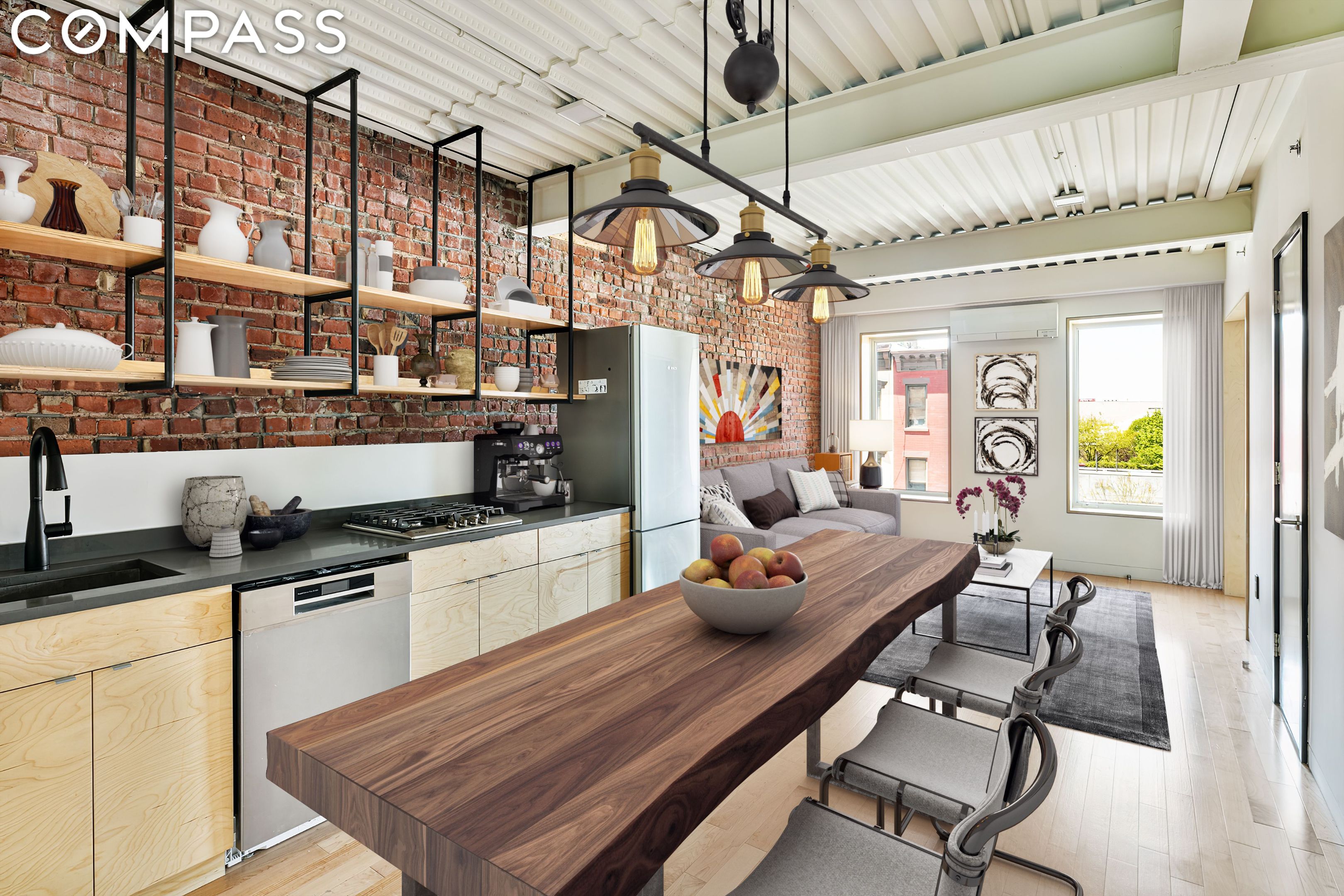 Now with two high end custom built closets with 15 shelves and ample hanging space! This Gowanus loft with modern and clean architectural finishes, also gives a nod to its historical industrial past, combined with international qualities rarely seen here in New York. This 2 bedroom offers a fully loaded kitchen with custom iron and wood pendant open shelving, and exposed iron beamed and sheathed ceilings through out. The smart layout is great for entertaining as it allows for a large kitchen island or dinning table and opens up to the living room. Triple pane, oversized casement windows keep the apartment quiet. The bedrooms overlook uninterrupted green backyard gardens. Surrounded by low rise buildings, the apartment gets excellent sun and sunsets as it has both eastern and western exposures. Other unique features include a sun piped bathroom, zoned central air, in unit washer/dryer, dishwasher and high-def video intercom.