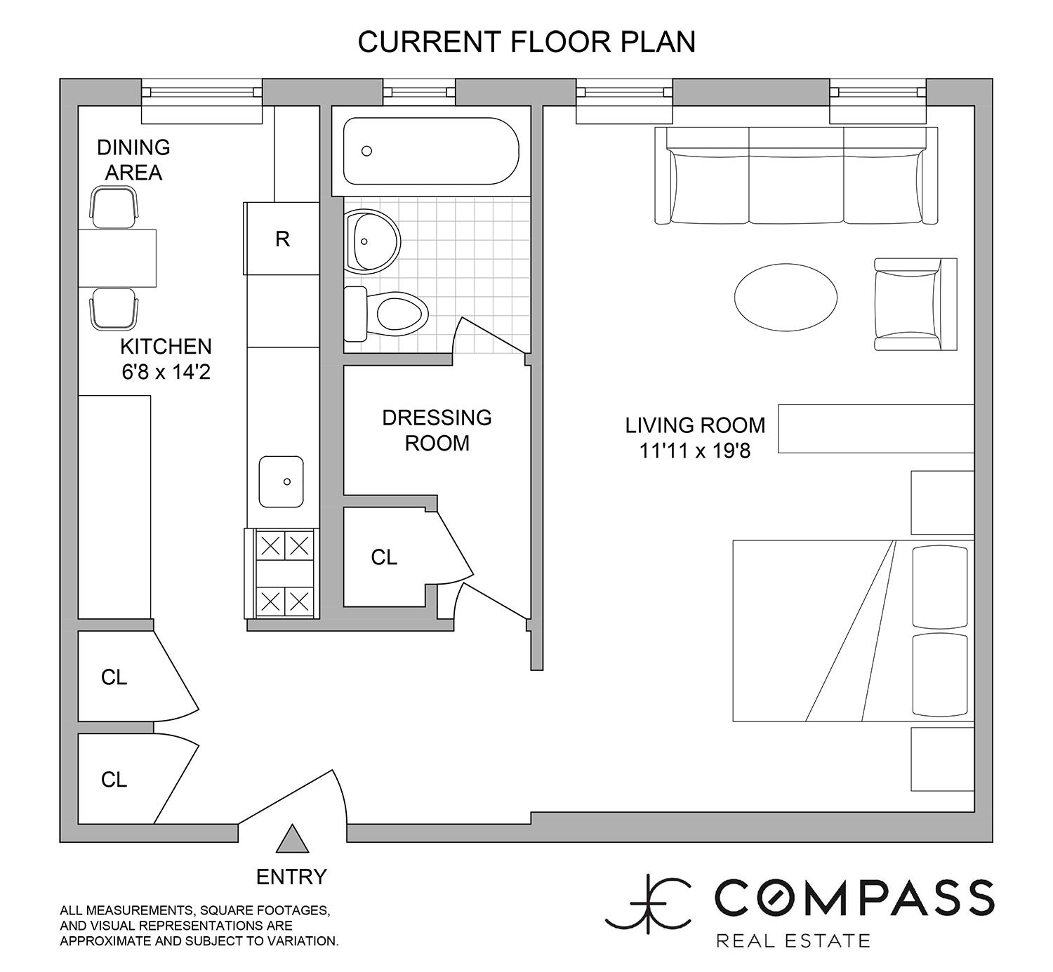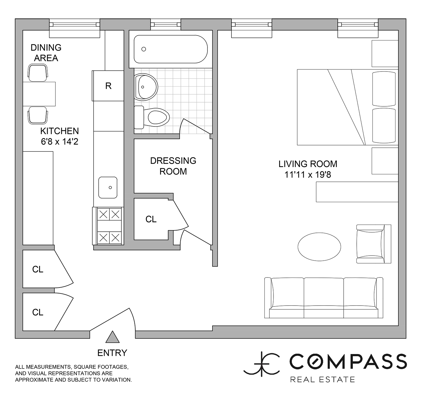 After passing through the spacious dressing room (which provides storage like a walk-in closet), you find a fully renovated, windowed bathroom whose design takes a tasteful spin on the classic Gotham aesthetic. Subway wall tiles are framed with charcoal grey grout, and so is the sage green penny floor tile. Matte black fittings complete the look.